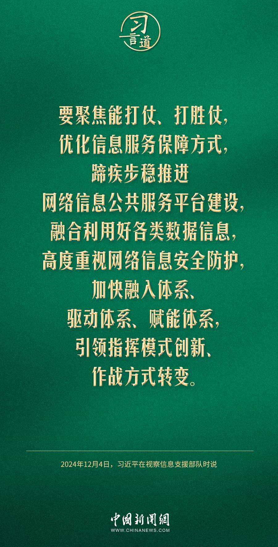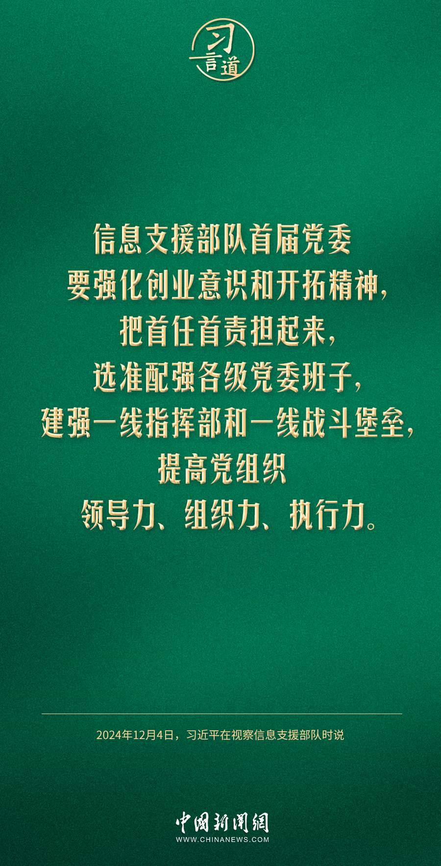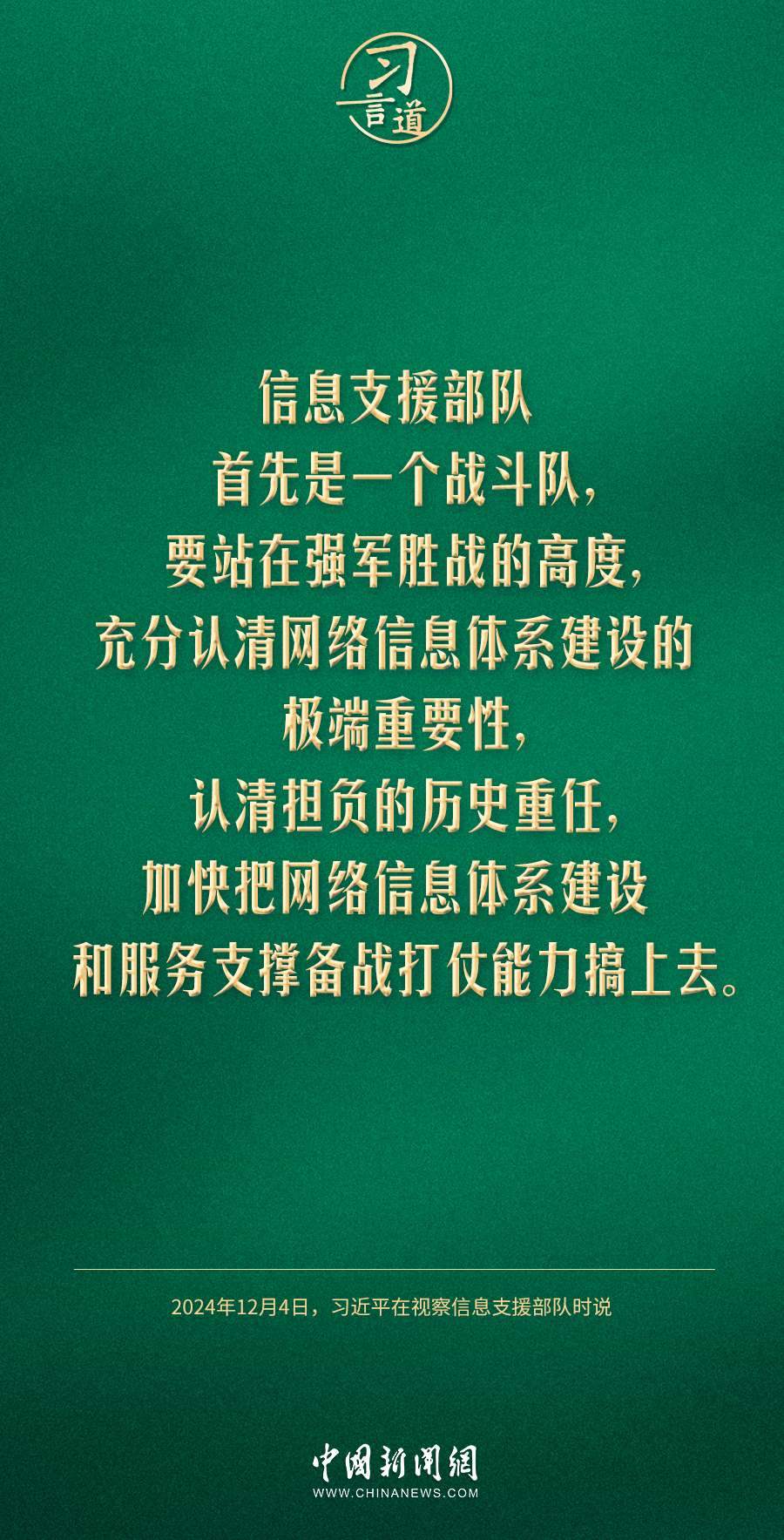 中共中央總書記、國家主席、中央軍委主席習(xí)近平4日視察信息支援部隊,代表黨中央和中央軍委,對信息支援部隊第一次黨代表大會的召開表示熱烈祝賀,向信息支援部隊全體官兵致以誠摯問候。習(xí)近平指出——