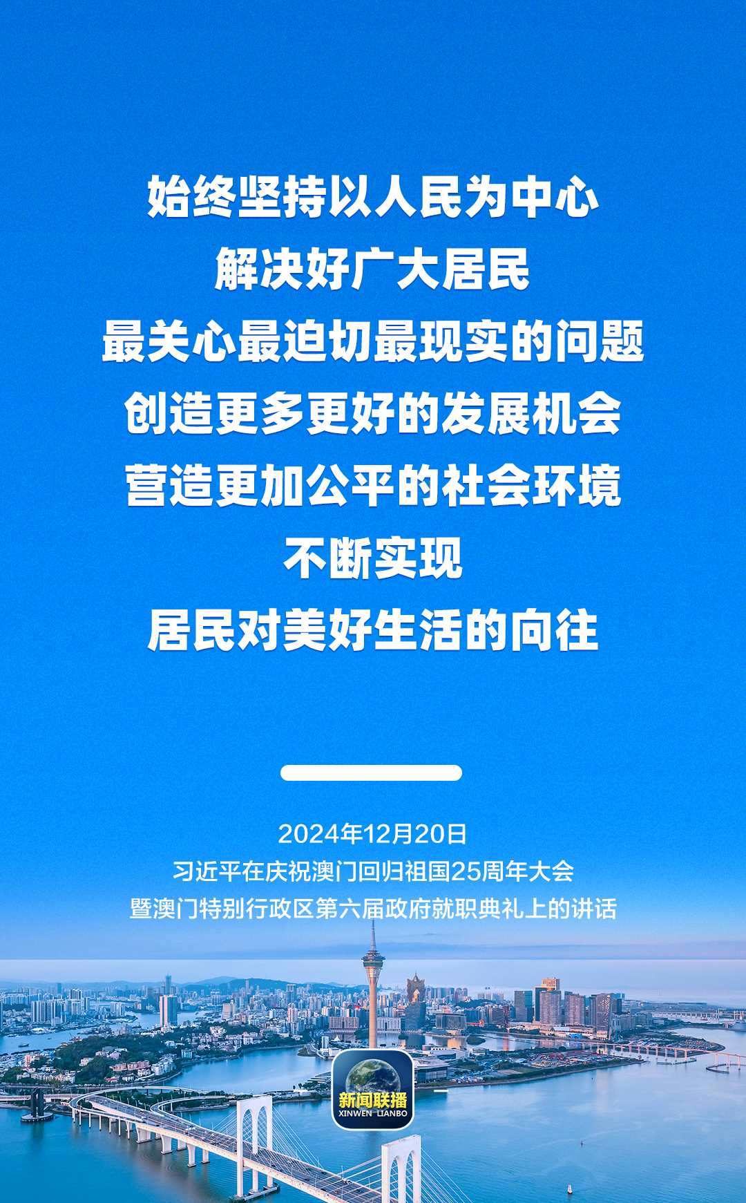 12月20日上午,慶祝澳門回歸祖國25周年大會暨澳門特別行政區(qū)第六屆政府就職典禮舉行。中共中央總書記、國家主席、中央軍委主席習(xí)近平出席并發(fā)表重要講話。