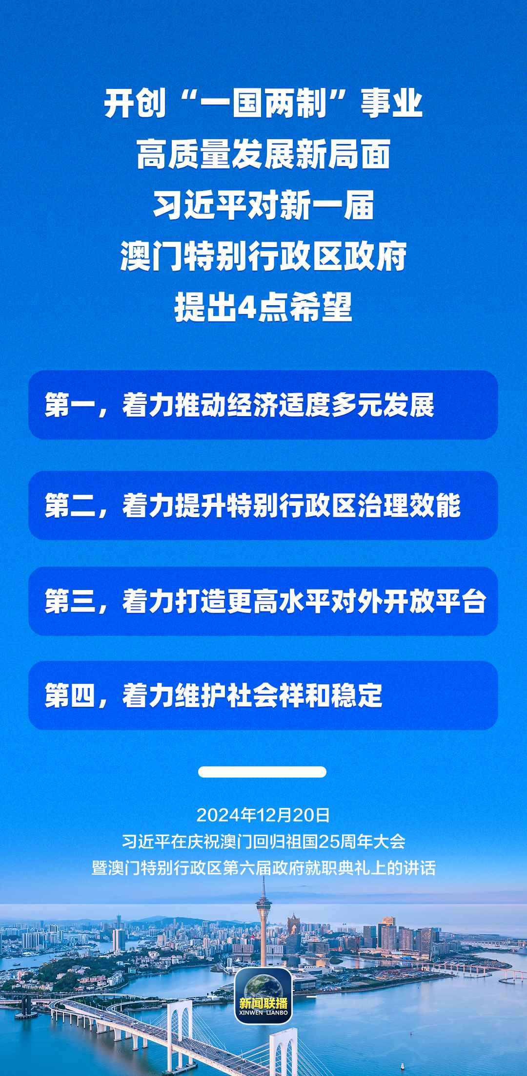 習(xí)近平強調(diào),只要全面準確、堅定不移貫徹“一國兩制”方針,有特別行政區(qū)政府和社會各界共同努力,有偉大祖國作堅強后盾,澳門一定能打開發(fā)展新天地、不斷創(chuàng)造新輝煌,一定能為以中國式現(xiàn)代化全面推進強國建設(shè)、民族復(fù)興偉業(yè)作出更大貢獻。