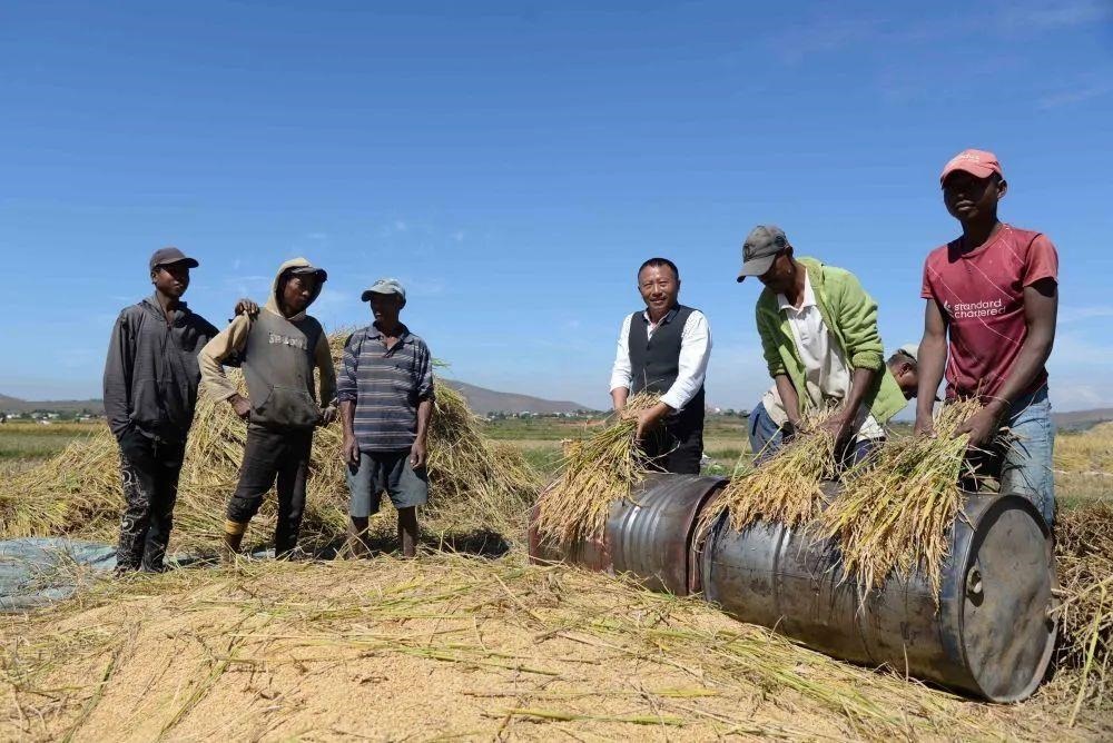 △在馬達加斯加,中國雜交水稻技術專家和當?shù)剞r(nóng)民一起收獲水稻。