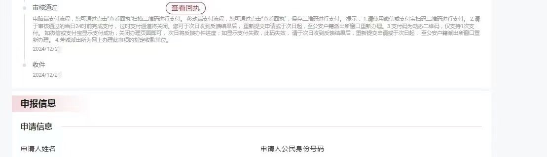 第二步:收到審核通過的短信提示后,使用電腦終端再次登錄北京市政務服務網(wǎng)進入“個人空間--我的辦件”,點擊“查看回執(zhí)”,使用微信或支付寶掃描二維碼進行支付。支付成功后,等待公安機關制作證件。
