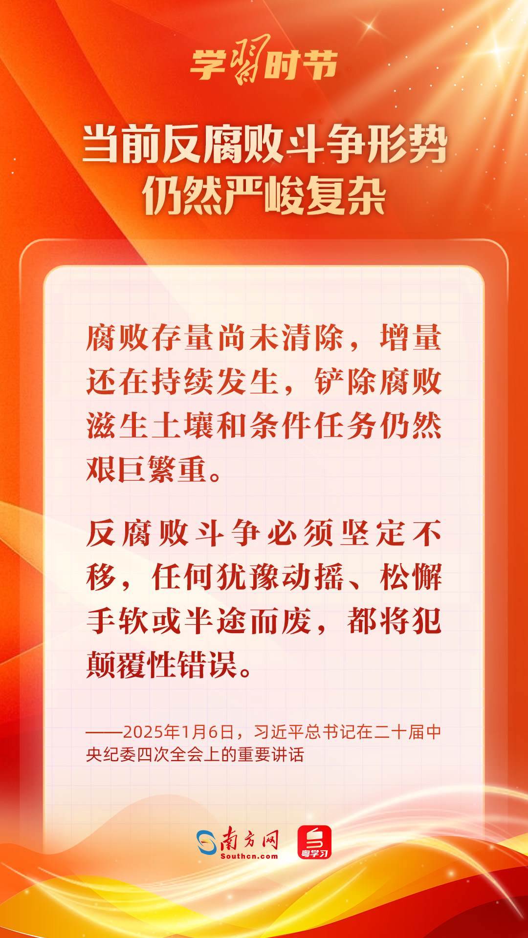 1月6日,中共中央總書記、國(guó)家主席、中央軍委主席習(xí)近平在中國(guó)共產(chǎn)黨第二十屆中央紀(jì)律檢查委員會(huì)第四次全體會(huì)議上發(fā)表重要講話,深刻把握反腐敗斗爭(zhēng)基本規(guī)律,深刻分析當(dāng)前反腐敗斗爭(zhēng)形勢(shì),對(duì)堅(jiān)決打好反腐敗斗爭(zhēng)攻堅(jiān)戰(zhàn)、持久戰(zhàn)、總體戰(zhàn)提出明確要求,對(duì)深入推進(jìn)全面從嚴(yán)治黨作出戰(zhàn)略部署。