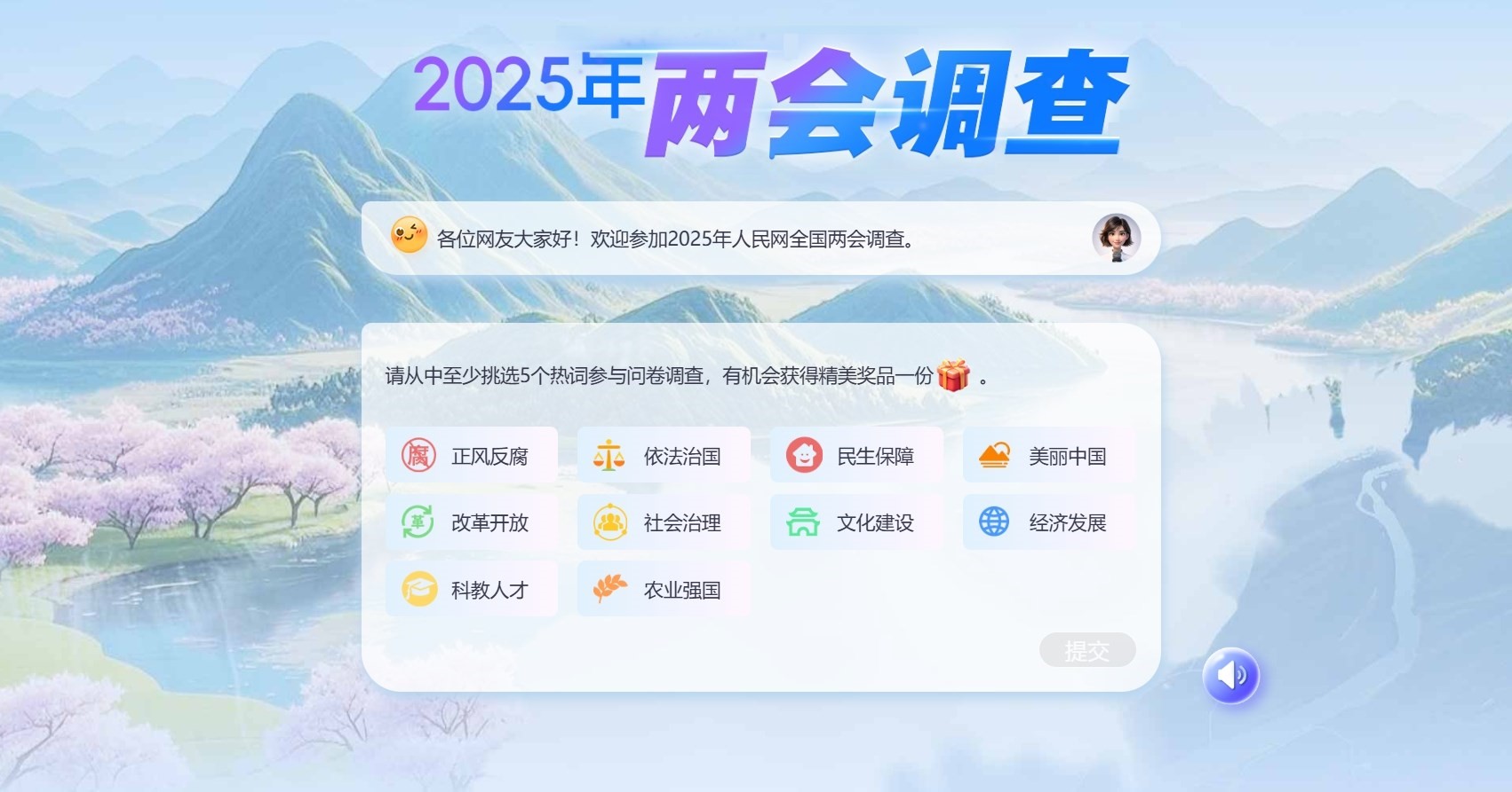 為感謝網(wǎng)友對(duì)人民網(wǎng)2025年全國(guó)兩會(huì)調(diào)查的支持,參與者有機(jī)會(huì)抽取精美獎(jiǎng)品1份。