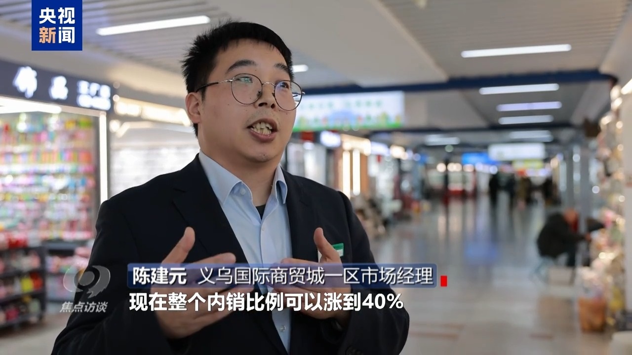 義烏國際商貿(mào)城一區(qū)市場經(jīng)理 陳建元:我們有一個(gè)統(tǒng)計(jì),拿我們的飾品行業(yè)來說,經(jīng)過這幾年培育,直播電商的快速發(fā)展,有些經(jīng)營戶轉(zhuǎn)型,現(xiàn)在整個(gè)內(nèi)銷比例可以漲到40%,比例還是有一個(gè)很明顯的提升。