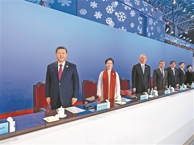 19時58分,在《和平——命運共同體》的樂曲聲中,習近平和夫人彭麗媛,同國際奧委會主席巴赫、亞奧理事會第一副主席霍震霆等步入主席臺,向觀眾揮手致意。全場響起長時間的熱烈掌聲。