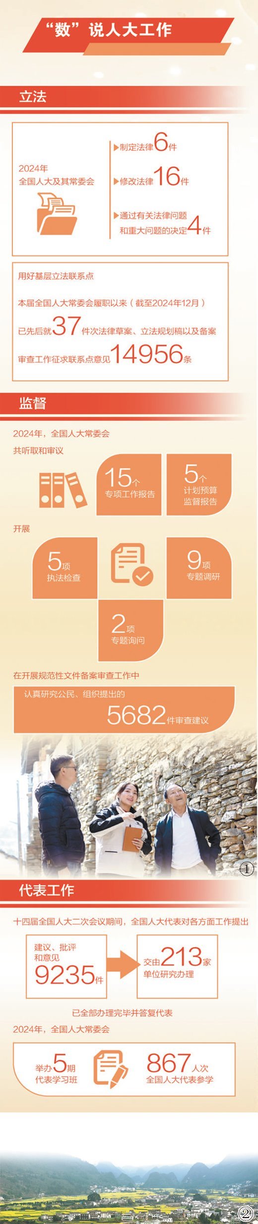 堅持正確監(jiān)督、有效監(jiān)督、依法監(jiān)督,2024年全國人大常委會緊緊圍繞新時代黨和國家中心工作開展監(jiān)督,聚焦推動高質(zhì)量發(fā)展、增進(jìn)民生福祉、加強(qiáng)財政經(jīng)濟(jì)工作監(jiān)督等方面工作共聽取和審議15個專項工作報告、5個計劃預(yù)算監(jiān)督報告,開展5項執(zhí)法檢查、2項專題詢問、9項專題調(diào)研,全年監(jiān)督項目均按照計劃要求依法有序開展。