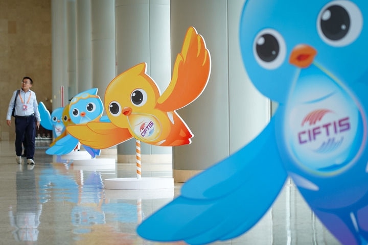 2024年9月11日在國(guó)家會(huì)議中心拍攝的服貿(mào)會(huì)吉祥物“福燕”形象。新華社記者 陳鐘昊 攝