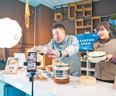 3月19日,內蒙古呼和浩特市玉泉區(qū)數字經濟總部基地直播間內,主播在推薦地方特色美食燒麥。