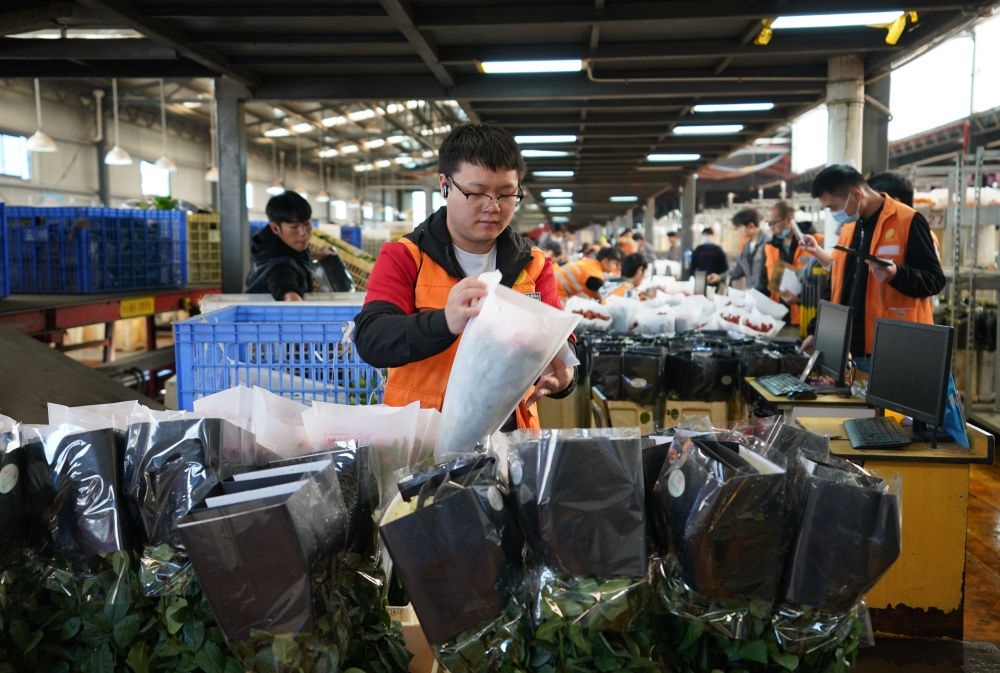 2022年11月11日,工作人員在昆明斗南花市給鮮花貼標(biāo)簽。快遞物流時(shí)效不斷優(yōu)化、冷鏈運(yùn)輸技術(shù)持續(xù)提升,也為中國(guó)鮮花加速“出?!北q{護(hù)航。