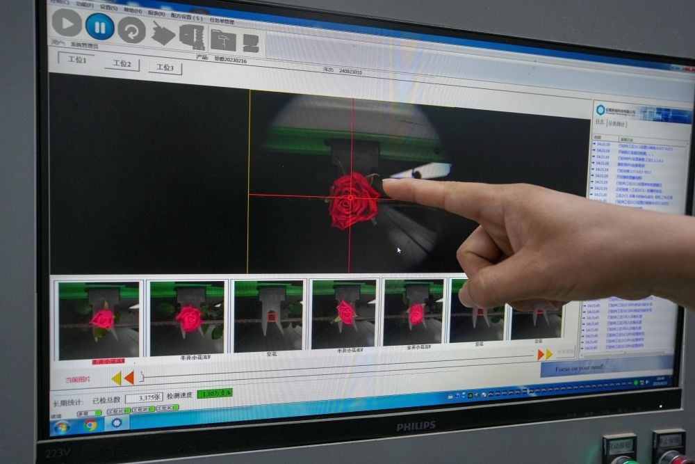 2024年8月23日,在云南晉寧花卉產(chǎn)業(yè)現(xiàn)代化示范園采后處理中心,計(jì)算機(jī)在實(shí)時(shí)監(jiān)測(cè)自動(dòng)分揀流水線上的鮮切花。