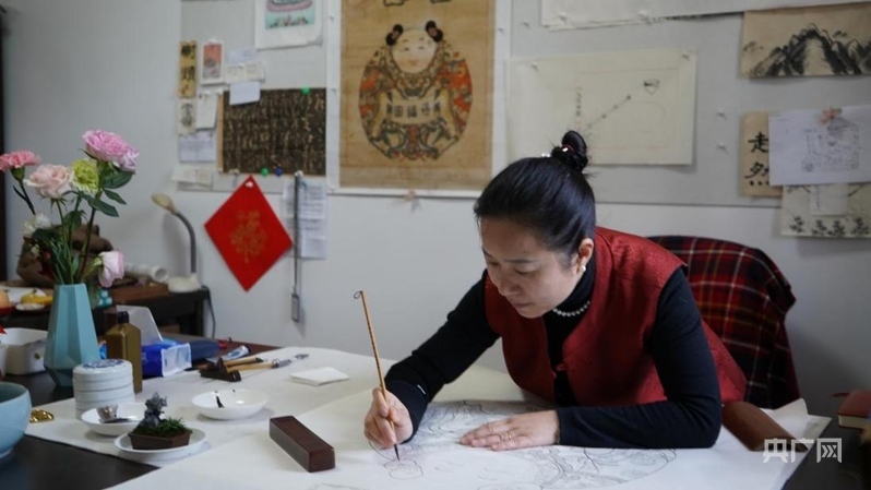 喬蘭蓉正在勾繪《一團和氣》線稿(央廣網(wǎng)記者 王紀民 攝)