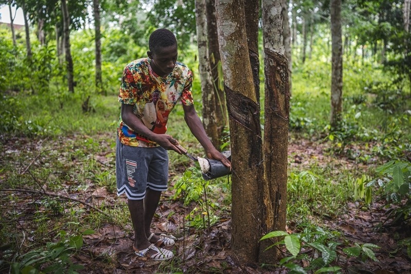 2025年5月30日,橡膠種植戶在科特迪瓦圣佩德羅省大貝雷比鎮(zhèn)收割橡膠。新華社記者 王冠森 攝