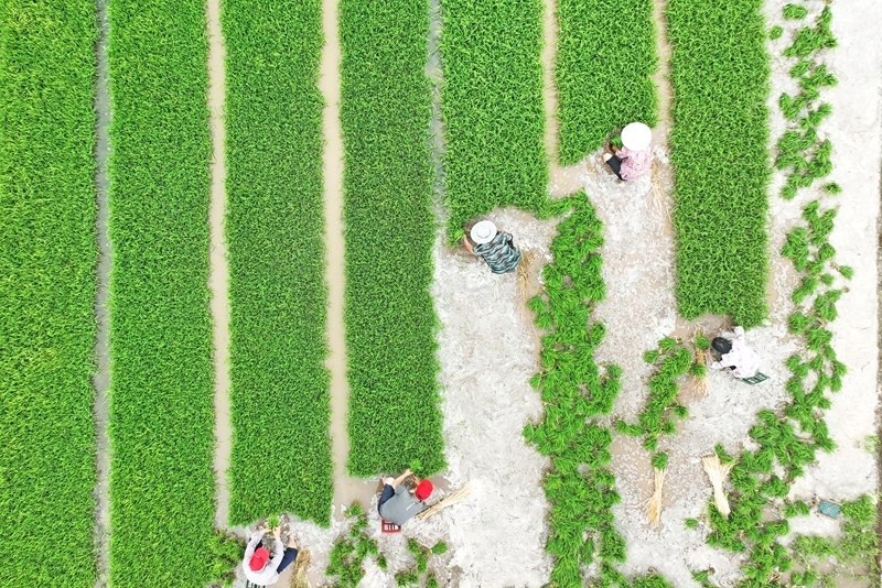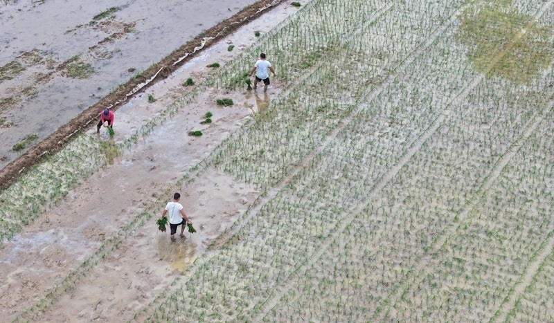 6月11日,在浙江省臺(tái)州市仙居縣雙廟鄉(xiāng),農(nóng)民在田間起運(yùn)秧苗(無(wú)人機(jī)照片)。