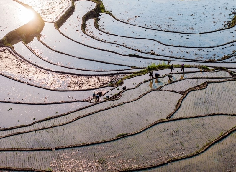 6月11日,湖北省秭歸縣沙鎮(zhèn)溪鎮(zhèn)長(zhǎng)春村村民在水田里插秧(無(wú)人機(jī)照片)。