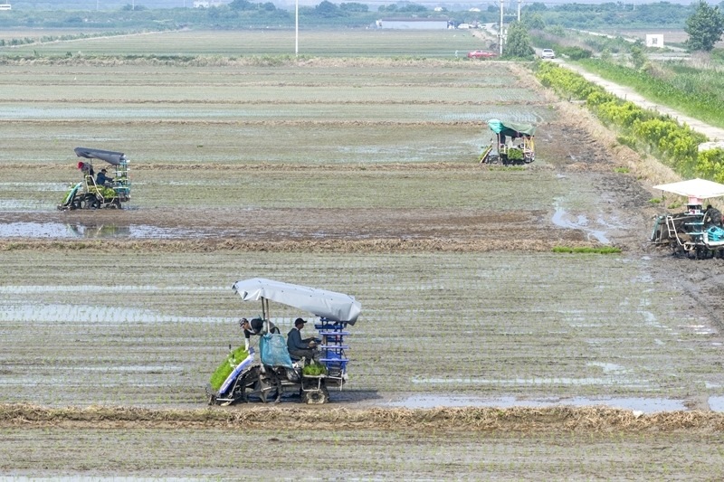 6月12日,在浙江省余姚市濱海現(xiàn)代農(nóng)業(yè)先導(dǎo)區(qū),農(nóng)機(jī)手駕駛插秧機(jī)進(jìn)行制種水稻插秧(無(wú)人機(jī)照片)。