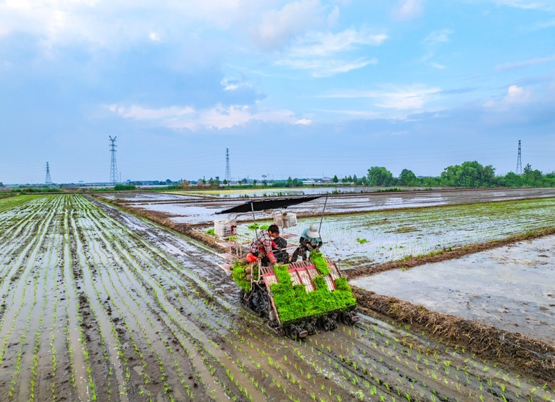 6月14日,在江蘇省興化市陳堡鎮(zhèn)蔣莊村,農(nóng)民在田間將剛起的秧苗裝車(無人機(jī)照片)。