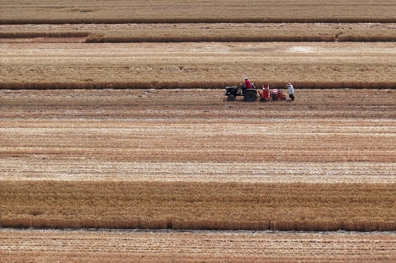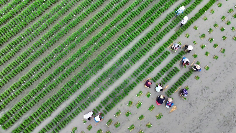 6月14日,在江蘇里下河地區(qū)農(nóng)科所(揚(yáng)州市農(nóng)科院),農(nóng)民在田里起秧、運(yùn)秧(無人機(jī)照片)。