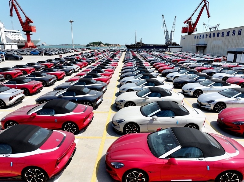 6月16日,在江蘇省連云港港東方港務分公司碼頭,大批車輛等待裝船外運(無人機照片)。5月份,貨物進出口總額38098億元,同比增長2.7%。