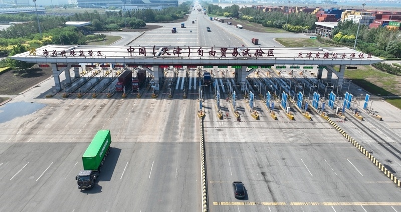 這是6月20日拍攝的天津自貿(mào)區(qū)天津港東疆片區(qū)入口處的中國(guó)(天津)自由貿(mào)易試驗(yàn)區(qū)海關(guān)特殊監(jiān)管區(qū)入口(無人機(jī)照片)。