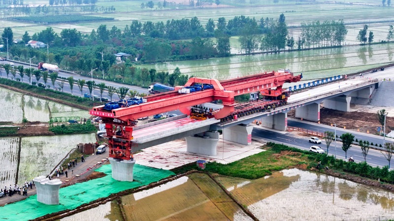 6月21日,在濰宿高鐵郯城沭河特大橋施工現(xiàn)場(chǎng),中鐵上海局工作人員在進(jìn)行箱梁架設(shè)(無(wú)人機(jī)照片)。