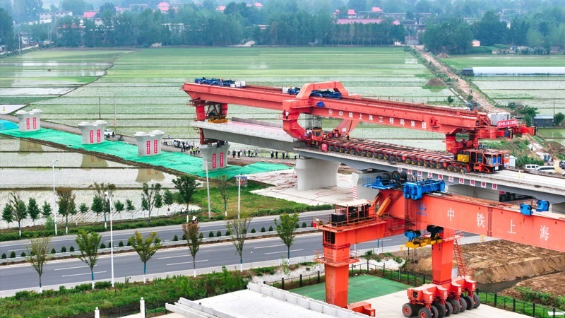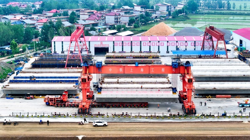 6月21日,在濰宿高鐵中鐵上海局郯城制梁場(chǎng),提梁機(jī)在提運(yùn)箱梁(無(wú)人機(jī)照片)。