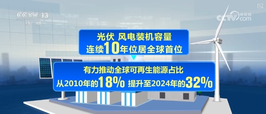 《報(bào)告》指出,作為全球最大能源消費(fèi)國(guó)與清潔能源投資國(guó),2024年,中國(guó)清潔能源投資規(guī)模為6250億美元,占全球比重的三分之一。光伏、風(fēng)電裝機(jī)容量連續(xù)10年位居全球首位,有力推動(dòng)全球可再生能源占比從2010年的18%提升至2024年的32%。
