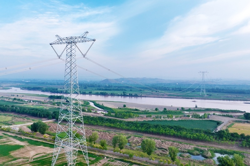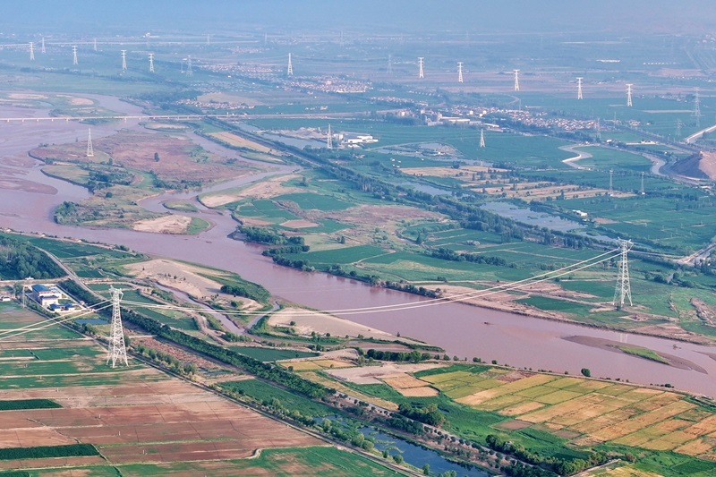 這是6月29日拍攝的“寧電入湘”工程寧夏中衛(wèi)市境內(nèi)跨黃河段線路(無人機(jī)照片)。