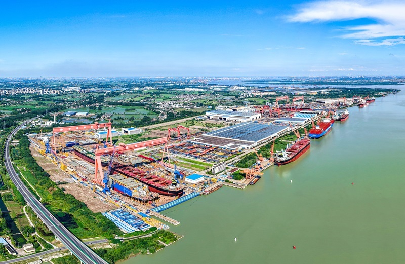 6月28日拍攝的位于江蘇省江都經濟開發(fā)區(qū)的揚州中遠海運重工有限公司生產廠區(qū)(無人機照片)。