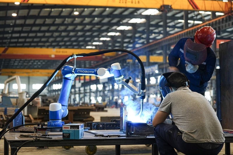 6月26日,在四川天府新區(qū)眉山片區(qū)青龍街道的新筑智能工程裝備制造有限公司車間內,工人們配合機器人焊接產品。