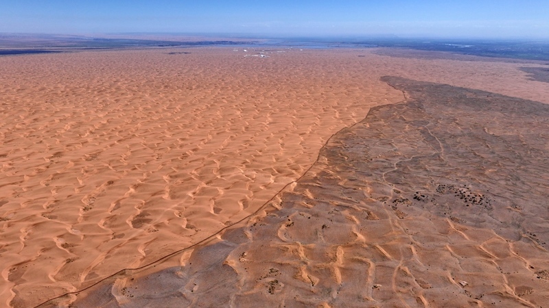 6月30日,在位于寧夏中衛(wèi)市長流水村的騰格里沙漠東南緣,隨著治沙工人將最后一列草方格穩(wěn)穩(wěn)扎下,這項跨越半個世紀(jì)的治沙工程,在騰格里沙漠寧夏境內(nèi)實現(xiàn)全面“鎖定”。一條長153公里、最寬處達(dá)38公里的固沙鎖邊帶蜿蜒開來。