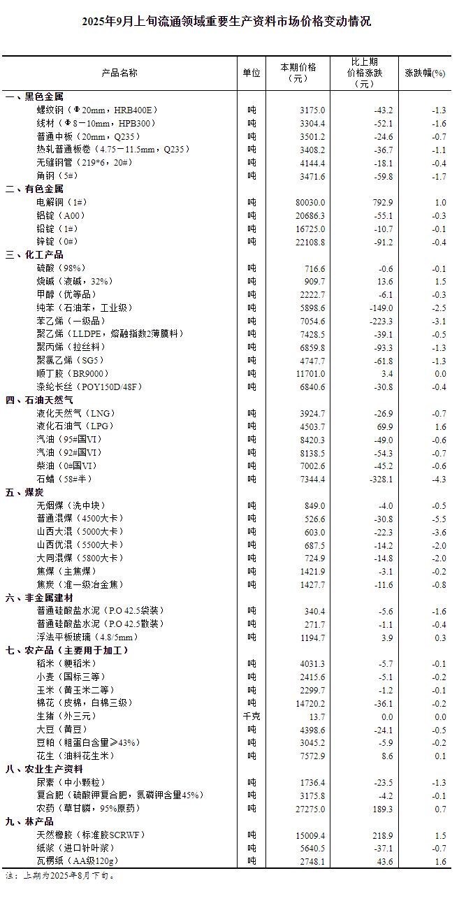 據(jù)國家統(tǒng)計局網(wǎng)站消息,國家統(tǒng)計局14日公布2025年9月上旬流通領域重要生產資料市場價格變動情況。