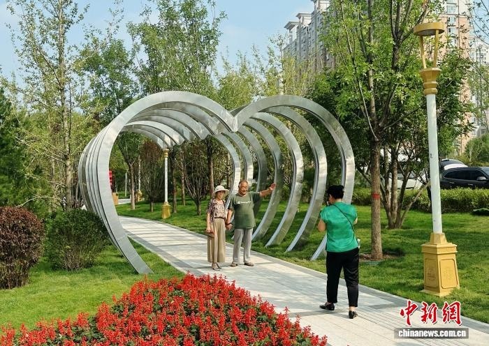 9月12日,民眾在山西省太原市迎澤大街月老廣場心形廊架下合影留念。 中新社記者 李庭耀 攝