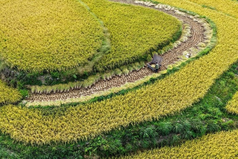 地處武陵山區(qū)腹地的重慶市黔江區(qū)五里鎮(zhèn)水稻種植面積5300畝,是武陵山地區(qū)糧食主要產(chǎn)區(qū)之一。秋收時(shí)節(jié),金黃色的水稻鋪滿山坡,稻農(nóng)們利用晴好天氣搶收稻谷,呈現(xiàn)出一派美麗的豐收畫卷。