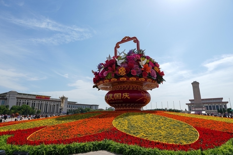 9月25日,2025年“祝福祖國(guó)”巨型花籃正式完工,亮相天安門(mén)廣場(chǎng)與市民共度佳節(jié)。今年“祝福祖國(guó)”花壇以喜慶的花籃為主景,花壇頂高18米,籃體高16米,籃盤(pán)直徑12米?;@體南側(cè)書(shū)寫(xiě)“祝福祖國(guó)”“1949-2025”字樣,籃體北側(cè)書(shū)寫(xiě)“歡度國(guó)慶”“1949-2025”字樣。籃內(nèi)選取了美好寓意的花卉,其中荷花寓意“和和美美”、橄欖枝寓意“榮耀和平”等,還結(jié)合和平鴿元素,體現(xiàn)“和平發(fā)展、欣欣向榮”。