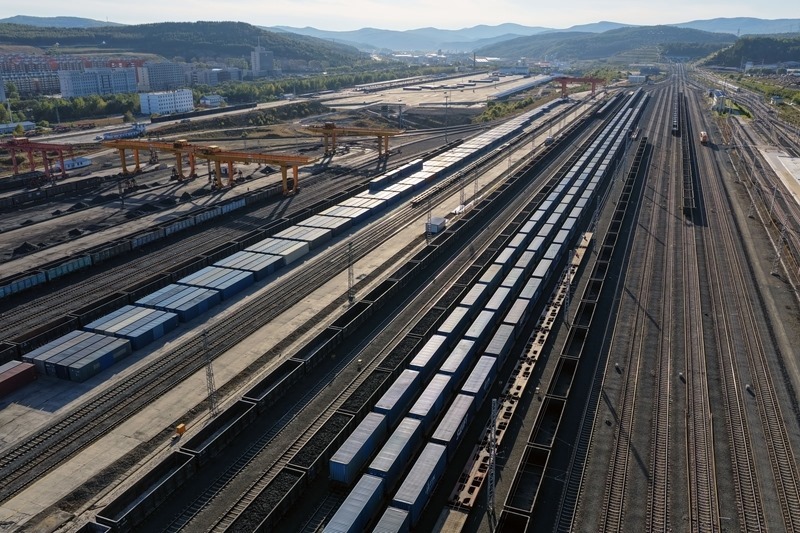 9月27日,滿載貨物的列車在綏芬河站北場進(jìn)行換裝作業(yè)(無人機(jī)照片)。