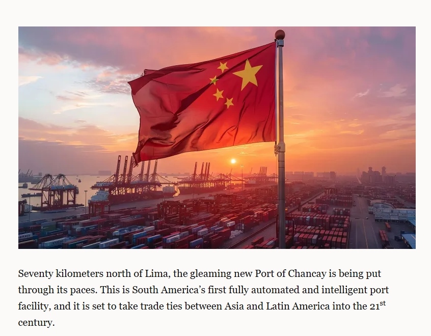 文章首先將目光投向在秘魯首都利馬以北70公里處的錢凱港。這個由中國和秘魯合作建設(shè)的嶄新港口,是南美洲首個全自動智能化港口設(shè)施,它將把亞洲與拉丁美洲的貿(mào)易關(guān)系帶入21世紀(jì)。隨著通往該港口的跨大陸公路和鐵路連接完工,錢凱港不僅要處理涉及南美洲太平洋沿岸的進(jìn)出口貨物,也將處理從阿根廷、巴西和巴拉圭穿越太平洋運(yùn)往中國的牛肉、大豆和小麥等貨物。