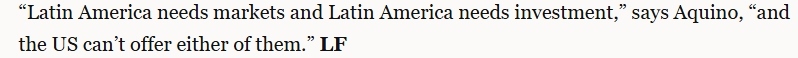 文章指出,并非所有人都對拉美與中國之間的合作感到滿意。華盛頓尤其擔(dān)心。不過,許多人認(rèn)為華盛頓影響拉丁美洲的能力有限。文章援引利馬國立圣馬科斯大學(xué)的亞洲經(jīng)濟(jì)專家卡洛斯·阿基諾的話指出,“拉丁美洲需要市場和投資,但美國無法提供其中任何一項”。