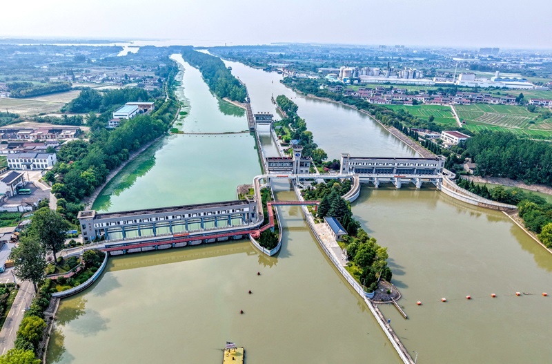 這是位于江蘇省揚州市江都區(qū)的南水北調(diào)東線一期工程運鹽閘、邵仙套閘、邵仙閘洞(7月6日攝,無人機照片)。
