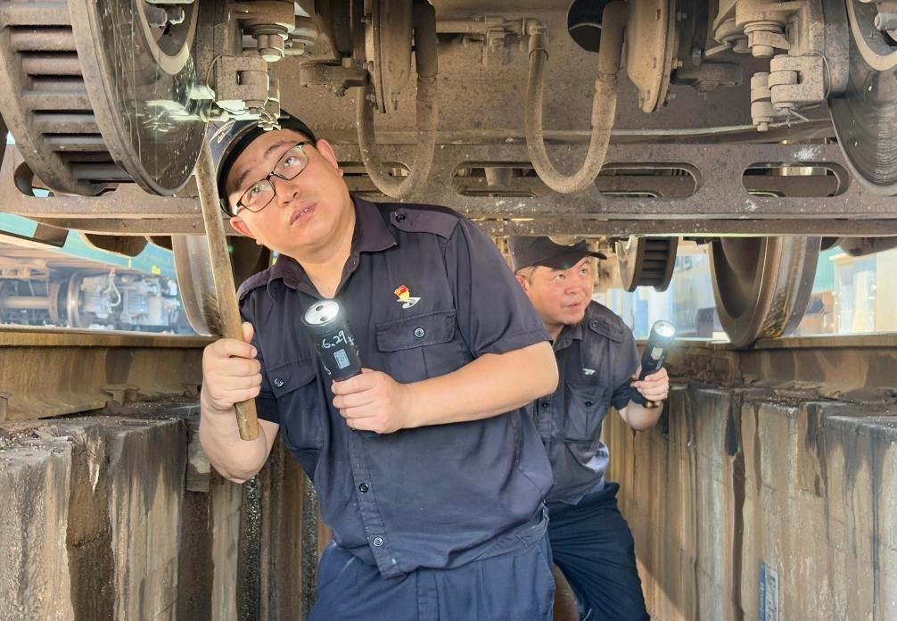 只見他俯下身鉆入車底,仔細檢查車輛的轉向架、制動裝置等關鍵部位。車底空間狹小、光線不足,許立業(yè)需借助手電筒弓著腰作業(yè),不一會兒,汗水就浸濕了工作服。為了預防中暑,他掏出一瓶藿香正氣水,一口氣喝完,然后擦了擦臉上的汗水,繼續(xù)朝下節(jié)車廂走去。