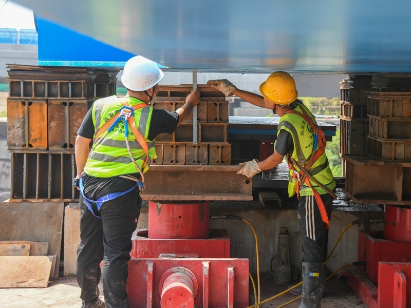 7月11日,工人在西渝高鐵跨營(yíng)達(dá)高速公路大橋進(jìn)行頂推施工作業(yè)。
