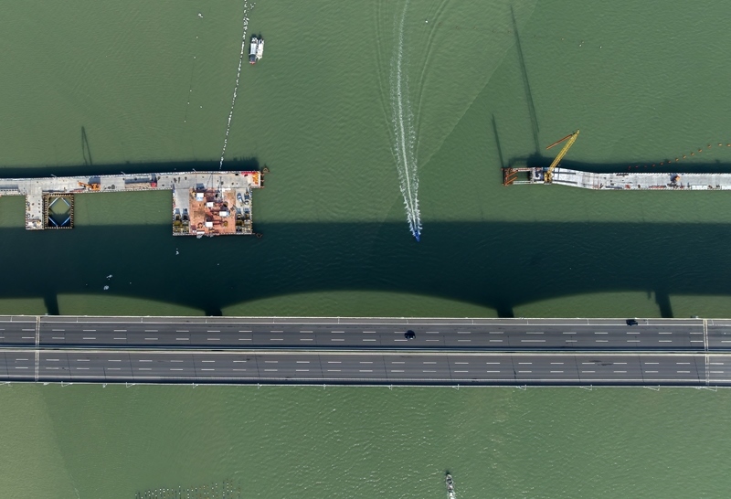 這是漳江灣跨海特大橋施工現(xiàn)場(7月16日攝,無人機(jī)照片)。