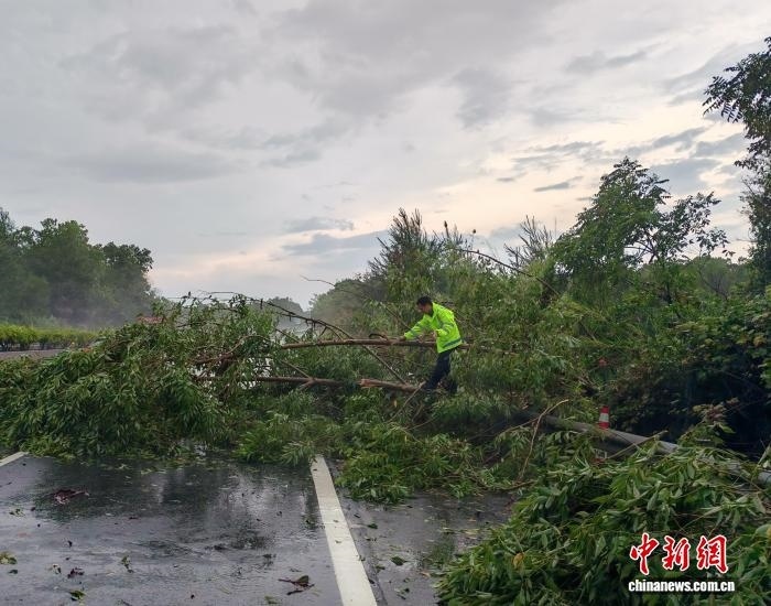 21日,云梧高速路政員清理被臺(tái)風(fēng)吹倒的樹木。劉朦 攝