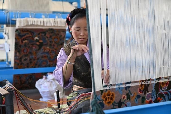 在日喀則市江孜縣的一家藏毯編織車間里,珍拉正盤腿坐在織架前,雙手在密集的經(jīng)線間靈巧地穿梭、挑動、打結(jié),一幅寓意吉祥的大鵬金翅鳥圖案,在她手下逐漸成形。