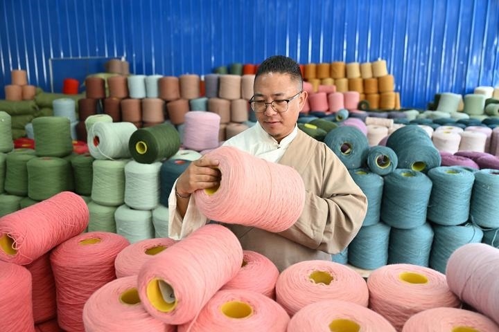 旦增稱來正在檢查染色后的紗線。新華社記者 李鑫 攝