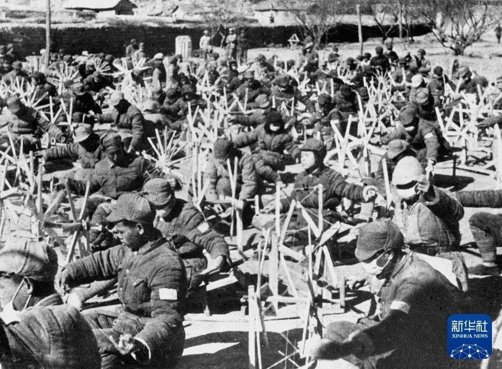 八路軍戰(zhàn)士坐在紡紗車(chē)前紡紗。新華社發(fā)