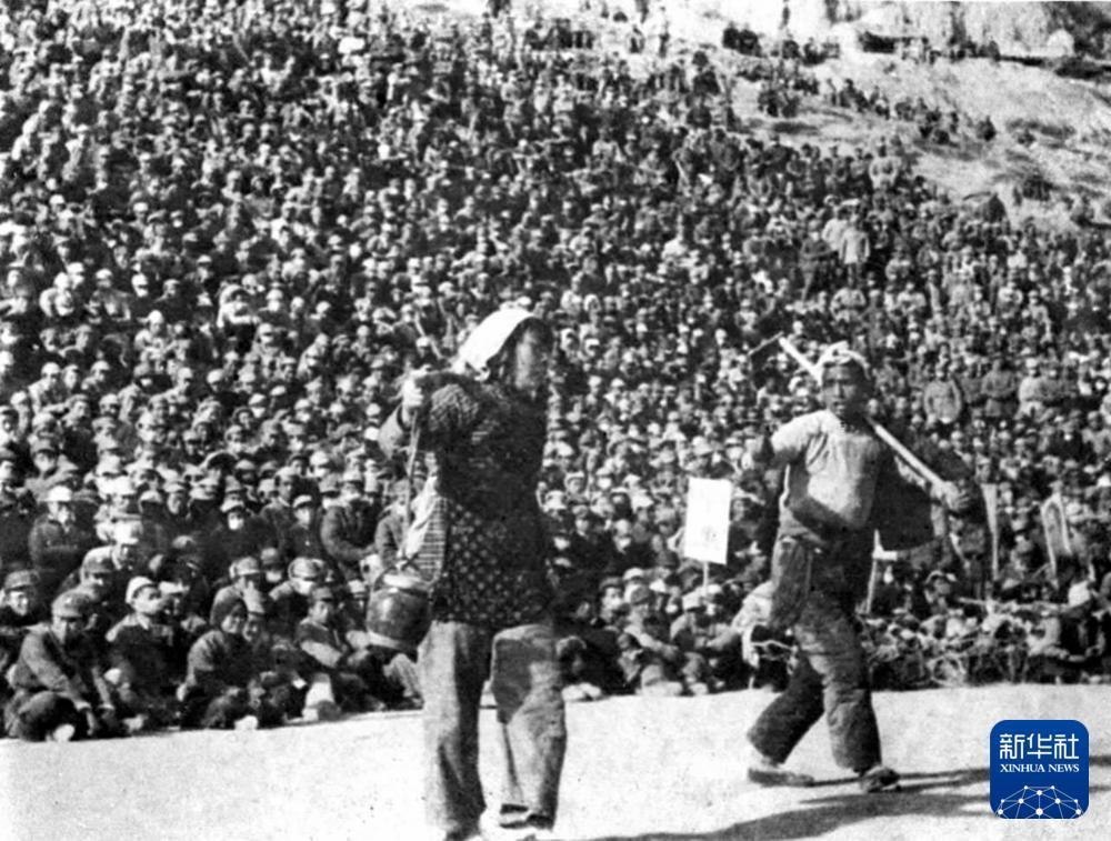 延安魯迅文藝學(xué)院王大化、李波在廣場(chǎng)為群眾演出秧歌劇《兄妹開(kāi)荒》。吳印咸 攝