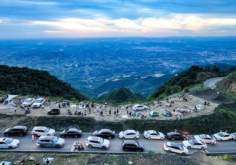 7月25日,四川省華鎣市市民駕車來(lái)到華鎣山21道拐避暑納涼(無(wú)人機(jī)照片)。