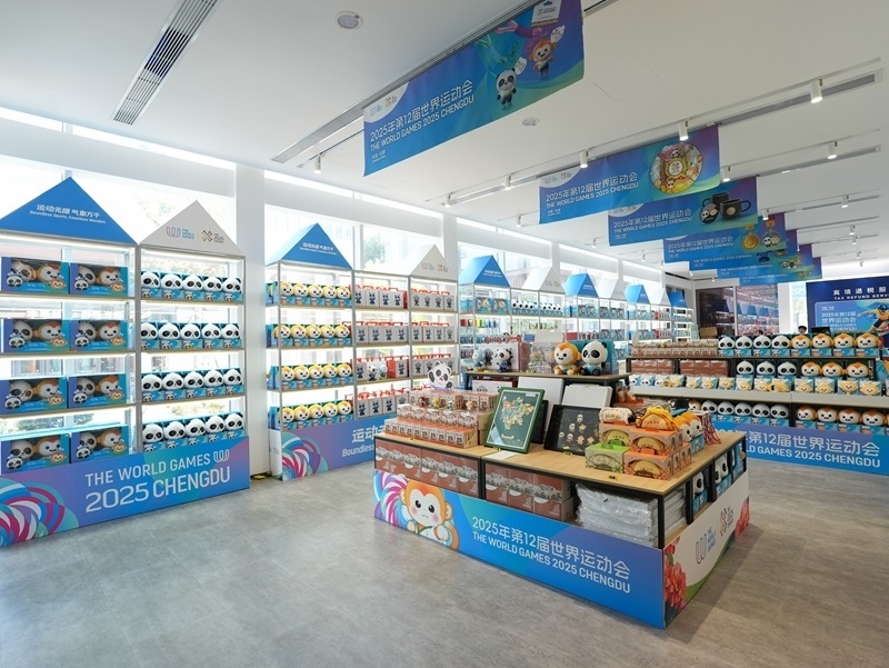 這是8月3日在成都世運會運動員村A區(qū)拍攝的官方特許商品零售店內(nèi)的紀念品。