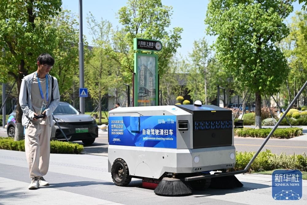 ↑ 在成都世運(yùn)會(huì)運(yùn)動(dòng)員村,工作人員引導(dǎo)自動(dòng)駕駛清掃車前往清掃區(qū)域。新華社記者 胥冰潔 攝