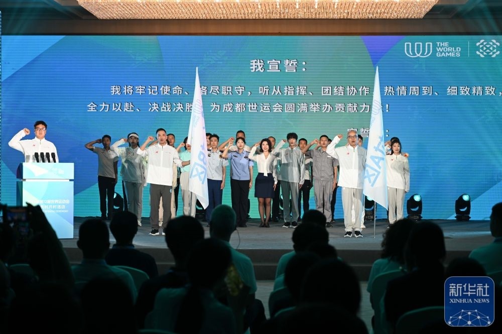↑ 在成都世運(yùn)會(huì)運(yùn)動(dòng)員村開村活動(dòng)上,工作人員代表集體宣誓。新華社記者 胥冰潔 攝